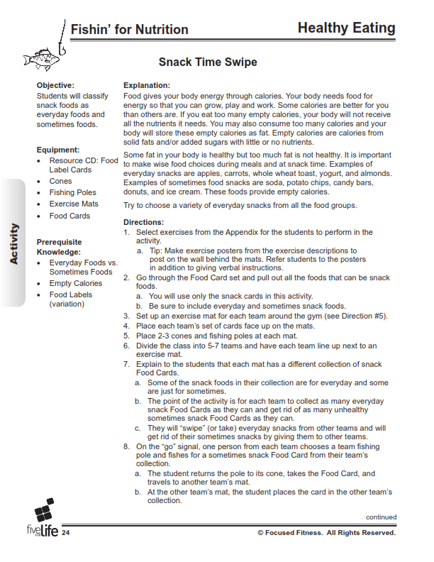 Fishin’ for Nutrition is a comprehensive nutrition program that delivers nutrition concepts through 25 fun and engaging movement-based activities. Students will learn to make sensible food choices, categorize foods, the energy content of foods, read food labels, recommended daily amounts (RDAs), the role of macronutrients and micronutrients and how nutrition links to body systems. Bonus activities instruct the Five Components of Health-Related Fitness and include exercises.